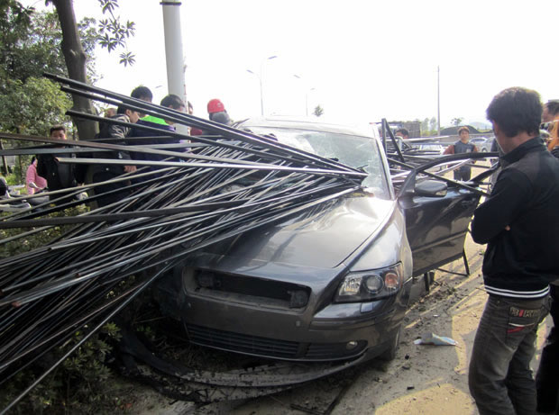 Un chofer chino escapó con apenas un rasguño después de que cientos de barras de acero se estrellaran contra el parabrisas de su coche. ¡Fue prácticamente un milagro que se salvara!
