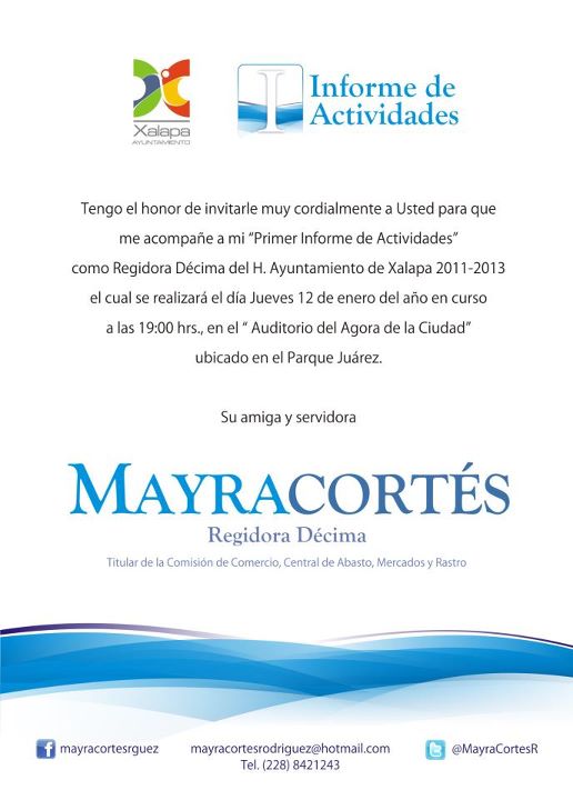 Mayra Cortés, Regidora Décima de Xalapa presentara Informe de Actividades La Lic. Mayra Cortés Rodríguez, estará rindiendo su “Primer Informe de Actividades” como Regidora Décima del H. Ayuntamiento de Xalapa 2011-2013, el cual se realizará este día Jueves 12 de enero del año en curso, a las 19:00 horas, en el “ Auditorio del Agora…