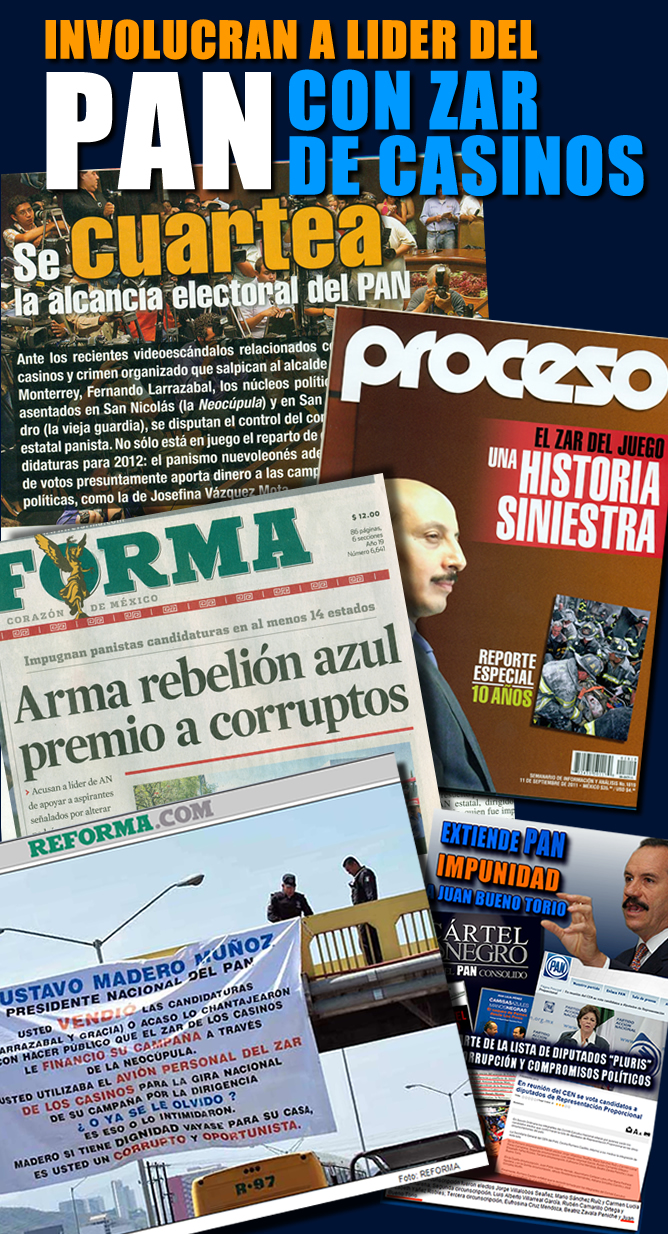 Este martes 6 de marzo, en mantas aparecidas en puntos estratégicos de Monterrey y publicadas por el Periódico Reforma, se acusa al dirigente nacional del PAN, Gustavo Madero, de haber recibido financiamiento del “Zar de los Casinos” y por ello, señalan, impuso como Candidatos a Diputados Plurinominales a panistas corruptos como el alcalde Larrazabal.