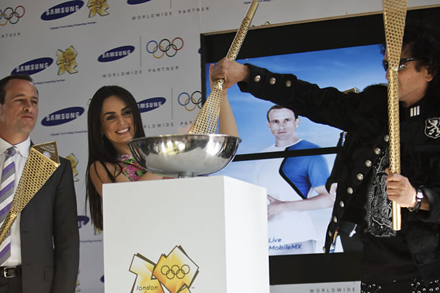 CIUDAD DE MÉXICO, 25 de mayo.- La actriz Ana de la Reguera y el rockero Alex Lora, líder de la agrupación El Tri, encendieron hoy de manera simbólica la Antorcha Olímpica, dando inicio a la cuenta regresiva para la justa deportiva que se celebrará del 27 de julio al 12 de agosto de 2012, en la ciudad de Londres, Inglaterra.
