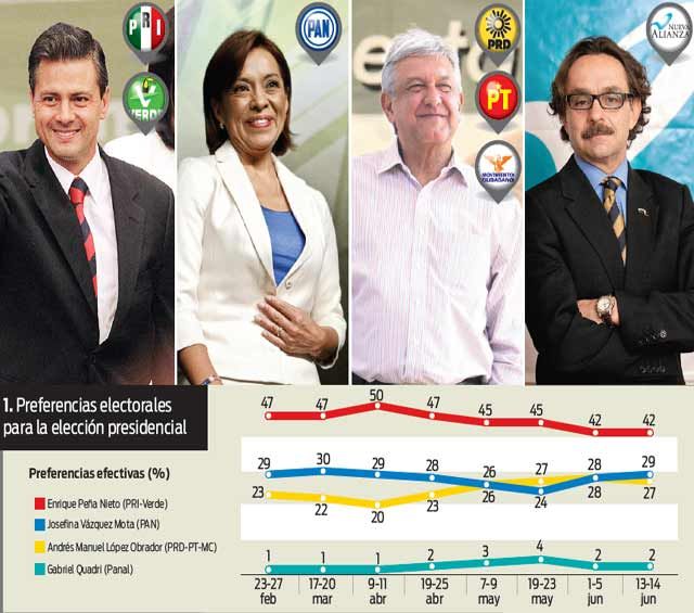CIUDAD DE MÉXICO, 18 de junio.- El candidato del PRI a la Presidencia de la República, Enrique Peña Nieto, se mantiene por encima de sus opositores con 42% de las preferencias electorales, de acuerdo con la encuesta nacional en vivienda BGC-Excélsior, realizada entre el 13 y 14 de junio.