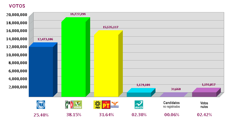 Con un acumulado para la votación presidencial de 98.95% y una participación histórica que supera al 63% del electorado, el IFE dio por terminada la difusión de resultados electorales preliminares superando el máximo reportado por este sistema para la elección federal de 2006, que fue de 98.45%.