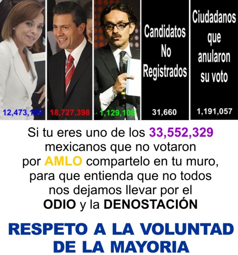 Sin embargo, así como ellos inundaron las redes sociales previo a las elecciones, ahora salen los que no están de acuerdo con el actuar del candidato de las izquierdas y sus simpatizantes, por lo que, haciendo uso de las redes sociales se han dado a la tarea de subir infinidad de imágenes solicitando al «peje» y a sus simpatizantes respeten la voluntad popular.