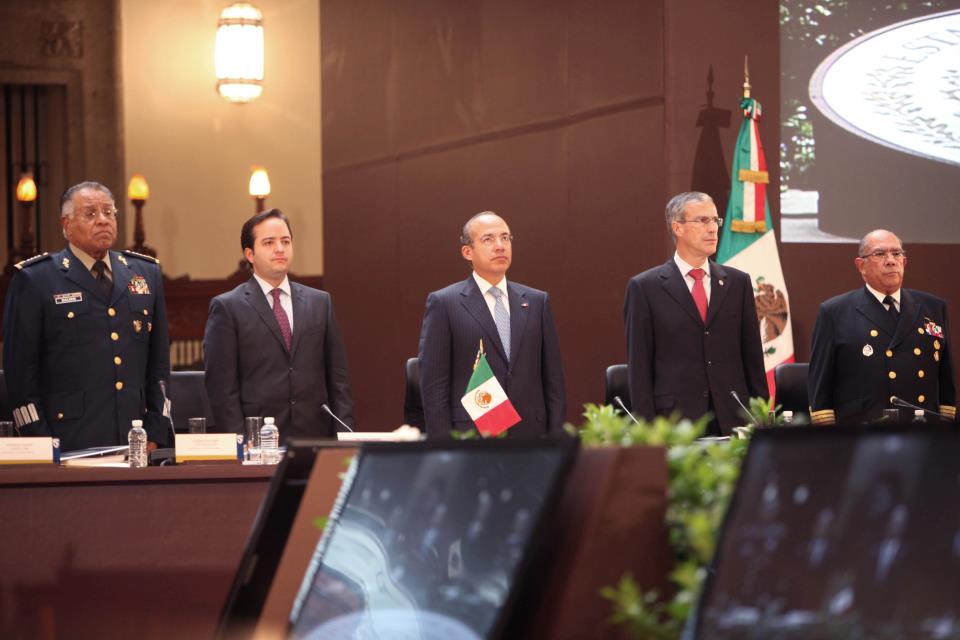 Calderón estuvo acompañado por los integrantes del gabinete de seguridad nacional, del que forman parte los secretarios de Gobernación, Alejandro Poiré Romero; de la Defensa Nacional, Guillermo Galván Galván; de Marina, Mariano Francisco Saynez Mendoza, y de Seguridad Pública, Genaro García Luna, y la titular de la Procuraduría General de la República (PGR), Marisela Morales Ibáñez.
