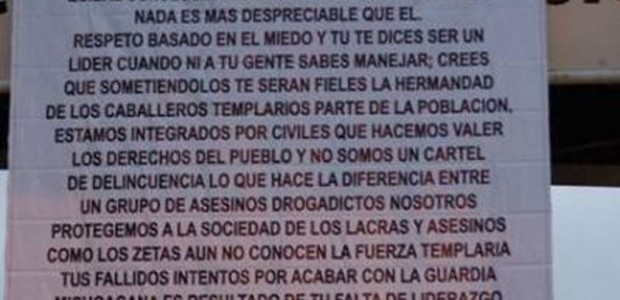 “A TODOS LOS ALIADOS E INTEGRANTES DE LOS ZETAS, EN ESPECIAL A MIGUEL ÁNGEL TREVIÑO, EL ZETA 40, QUE SE TE OLVIDO TODA LA SANGRE DE INOCENTES QUE A DERRAMADO REALIZANDO A TAQUES EN LUGARES PÚBLICOS, ENTRE OTRAS COSAS TODO POR SU AMBICIÓN, AVARICIA Y HAMBRE DE PODER, EL CUAL QUIERE CONSEGUIR PASANDO POR ENCIMA DEL PUEBLO NADA ES MAS DESPRECIABLE QUE EL RESPETO BASADO EN EL MIEDO Y TU TE DICES LÍDER CUANDO NO SABES MANDAR A TU GENTE, CREES QUE SOMETIÉNDOLOS TE SERÁN FIELES, LA HERMANDAD DE LOS CABALLEROS TEMPLARIOS NO ES PARTE DE LA POBLACIÓN ESTAMOS INTEGRADOS POR CIVILES QUE HACEMOS VALER LOS DERECHOS DEL PUEBLO Y NO SOMOS UN CARTEL DE DELINCUENCIA LO QUE HACE LA DIFERENCIA DE UN GRUPO, ASESINOS DROGADICTOS, NOSOTROS PROTEGEMOS A LA SOCIEDAD DE LAS LACRAS Y ASESINOS COMO LOS ZETAS, AUN NO CONOCEN LA FUERZA TEMPLARÍA, TUS FALLIDOS E INTENTOS POR ACABAR CON LA GUARDIA MICHOACANA ES RESULTADO DE TU FALTA DE LIDERAZGO Y A DIFERENCIA DE DE USTEDES, NOSOTROS ESTAMOS UNIDOS HAY QUE SABER LUCHAR PARA GANARSE EL RESPETO DE OTROS, Y POR ESO NOS ATREVEMOS A DECIR Y APROMETER A LA SOCIEDAD QUE ASÍ COMO MICHOACÁN SERÁ PAZ EN TIEMPOS DE GUERRA, TAMBIÉN LO SERÁ PARA LOS ESTADOS DAÑADOS POR LA MANO DE MIGUEL ÁNGEL TREVIÑO. ATENTAMENTE LOS CABALLEROS TEMPLARIOS GUARDIA MICHOACANA” (sic).