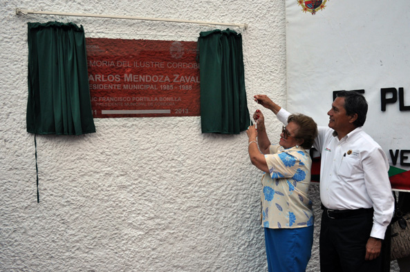 Córdoba, Ver.- En memoria del ilustre ex alcalde de Córdoba, doctor Carlos Mendoza Zavala, las autoridades y familiares, develaron una placa que se colocó en la calle 3, avenida 4 y ex vía del Huatusquito, donde el actual gobierno que preside Francisco Portilla Bonilla, realizó trabajos de rehabilitación a las escalinatas y drenaje con una inversión de 201 mil 208 pesos.