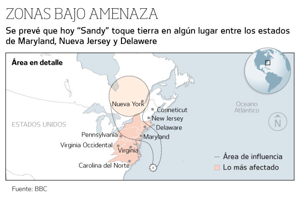 «Sandy», de categoría uno de la escala Saffir-Simpson, se encuentra a unos 505 kilómetros al sur-sudeste de la ciudad de Nueva York y a unos 425 kilómetros de Atlantic City (Nueva Jersey).