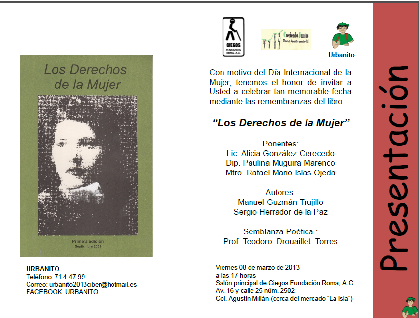 Con motivo del Día Internacional de la Mujer, este 8 de marzo se realizará la presentación del libro » “Los Derechos de la Mujer”, escrito por Manuel Guzmán Trujillo y Sergio Herrador de la Paz, en el Salón principal de Ciegos Fundación Roma, A.C. ubicado en la av. 16 y calle 25 número 2502 de la ciudad de Córdoba, Veracruz.