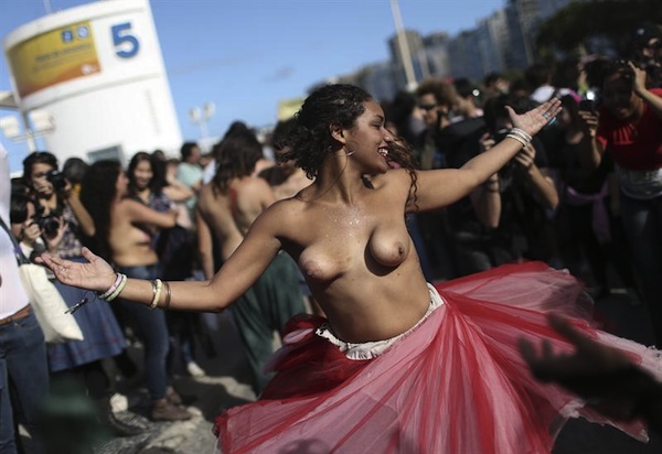 Entre 1.500 y 2.000 mujeres y simpatizantes, muchas de ellas con sus senos descubiertos y el cuerpo pintado, según los números divulgados por la Policía Militarizada (PM) de Río de Janeiro, marcharon por las calles de los barrios de Ipanema y Copacabana, después de salir del punto de encuentro de la vigilia católica.