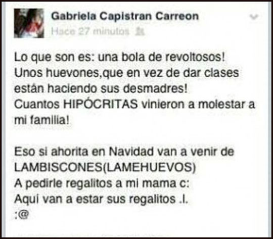 Lo anterior, luego de que la hija de la legisladora, alumna de secundaria en el Instituto Patria, una escuela privada de su municipio de residencia, Tlapacoyan, publicara textualmente en su muro de “Facebook” lo siguiente: “Los maestros son una bola de revoltosos! Unos huevones que en vez de dar clases están haciendo sus desmadres! Cuántos hipócritas vinieron a molestar a mi familia. Eso sí, ahorita en Navidad van a venir de lambiscones (lamehuevos) a pedirle regalitos a mi mamá c: aquí van a estar sus regalitos .I. : @”.