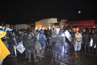 Tras mantener el paro por más de 47 horas, los trabajadores del campo fueron tratados de manera brutal por los elementos, quienes incluso al querer salvaguardar sus vidas, fueron emboscados por los policías, destruyeron unas cinco camionetas a golpes, además de dejar inconscientes a cuatro personas de la tercera edad sobre la cinta asfáltica.
