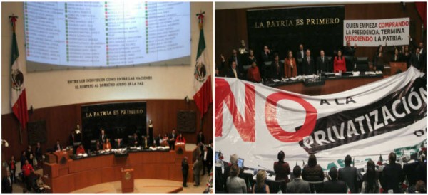 Antes de que se votara la reforma, durante la sesión que se prolongó unas 12 horas, el PRD tomó la tribuna y colocó una manta que cubrió la totalidad de la mesa directiva y en la que se leía: “No a la Privatización de Pemex y CFE”.