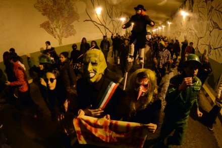 “Lamehuevos del Estado. Sin dignidad”, se advertía en las pancartas y lonas de tela que portaban estudiantes universitarios, ataviados de negro y con los rostros pintados de rojo –para simular sangre–, quienes criticaron el asesinato de tres estudiantes y la desaparición de 43 más de la Normal Rural de Ayotzinapa, Guerrero, ocurridos el 26 y 27 de septiembre.