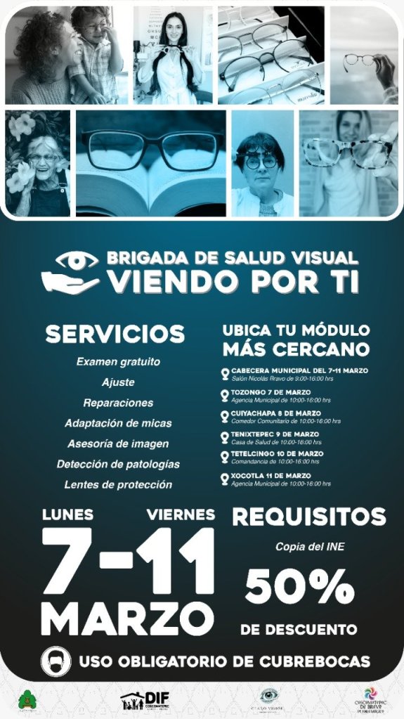 La Brigada de Salud Visual “Viendo por ti” promovida por el organismo asistencial en coordinación con un grupo óptico privado, contará con un módulo permanente en el salón Nicolás Bravo de 9:00 a 16:00 horas del 7 al 11 de marzo, así como módulos itinerantes en inmuebles públicos en Tozongo, Cuiyachapa, Tenixtepec, Tetelzingo y Xocotla en horario de 10:00 a 16:00 horas.