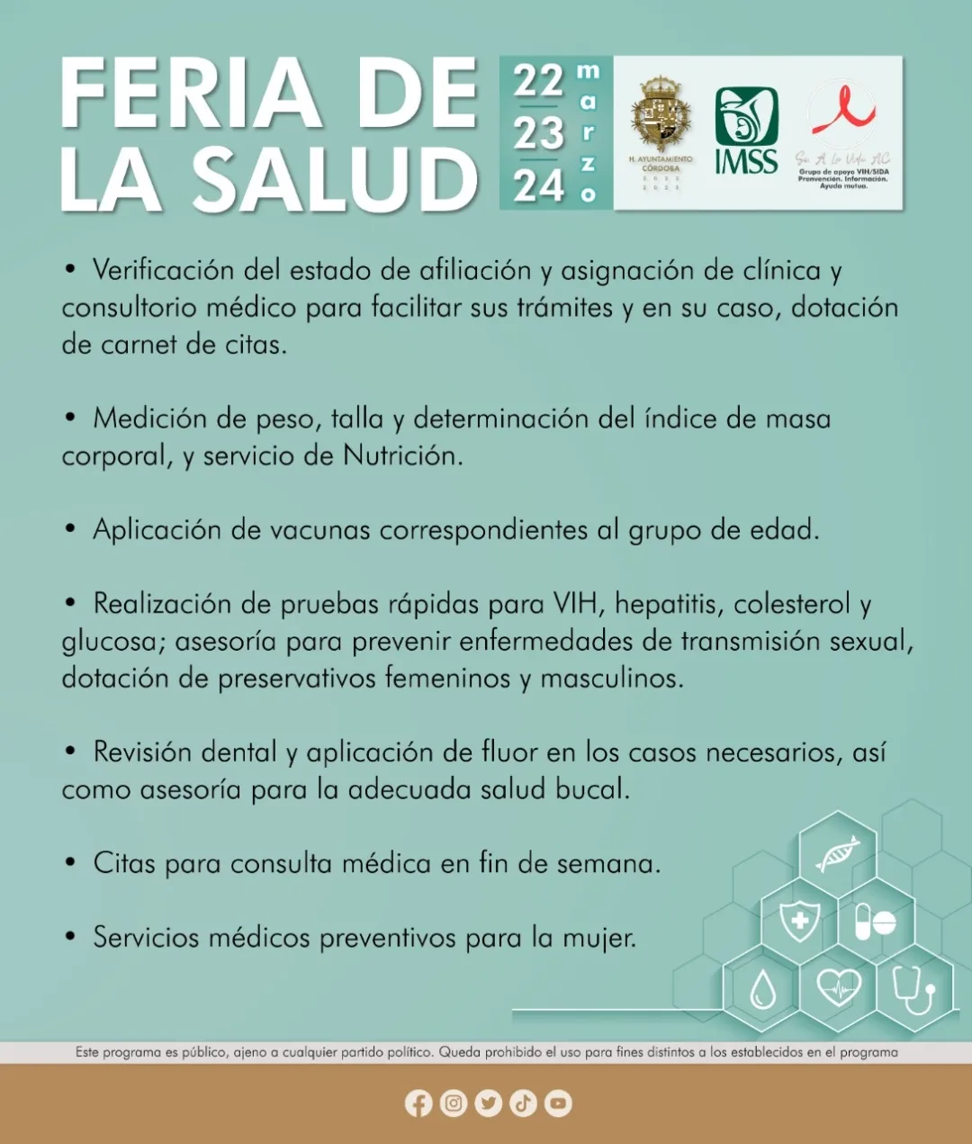Córdoba, Ver.- El Ayuntamiento de Córdoba, el Instituto Mexicano del Seguro Social (IMSS) y la asociación civil «Sí, a la Vida», llevarán a cabo la Feria de la Salud, donde las y los derechohabientes podrán verificar su estado de afiliación, servicio de nutrición, esquemas de vacunación y pruebas rápidas de VIH, hepatitis, colesterol y glucosa.