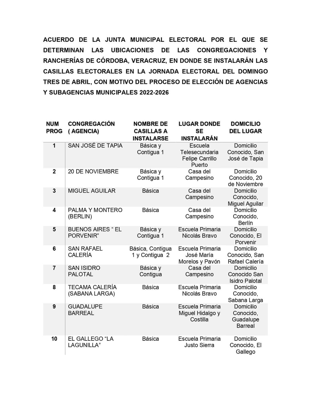 Por otra parte, en cumplimiento al principio de máxima publicidad, se dio a conocer el listado integrado al acuerdo de la Junta Municipal Electoral por el que se determina en dónde se instalarán 47 casillas en congregaciones y rancherías de Córdoba para el proceso de elección de Agentes y Subagentes Municipales.