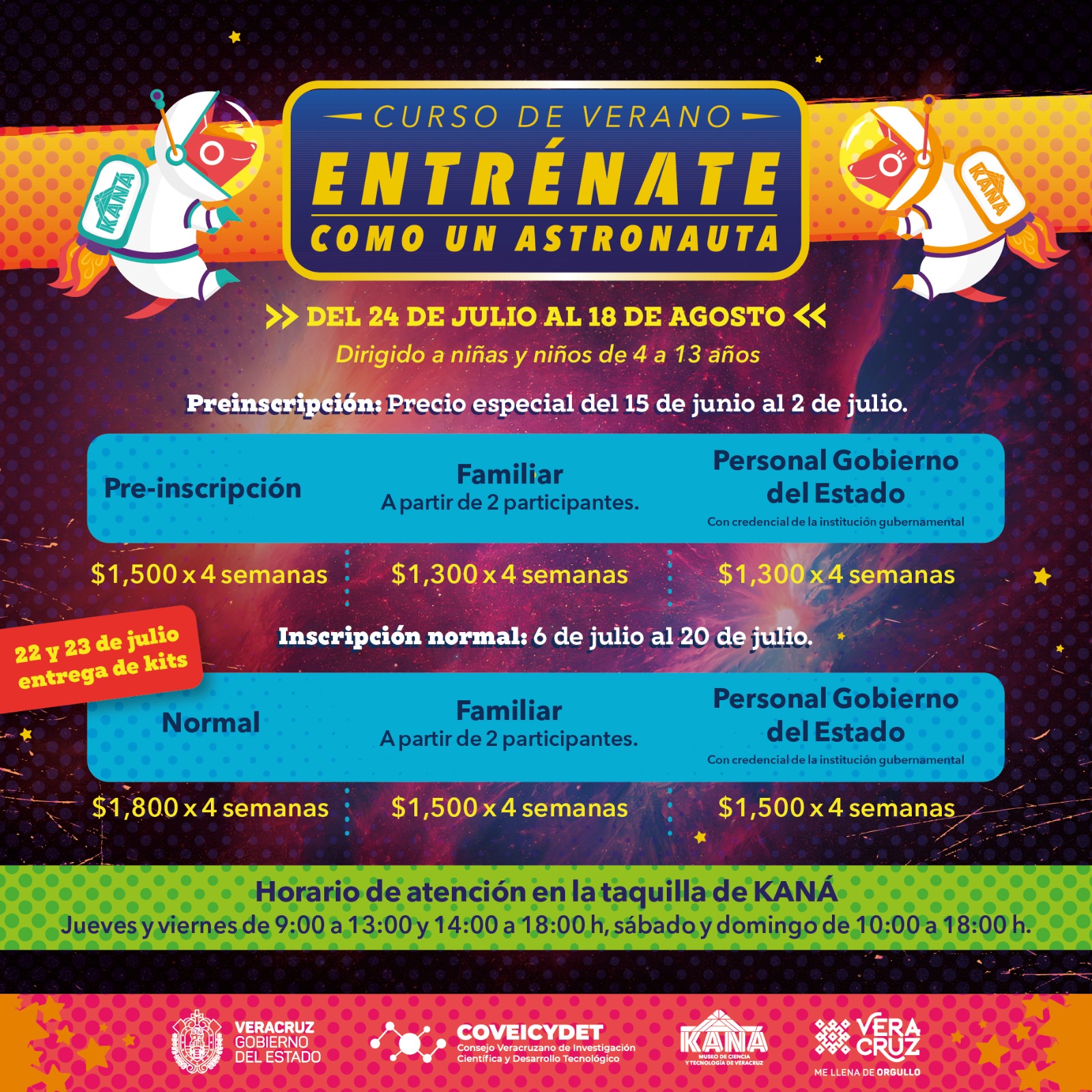 Xalapa, Ver.- El Consejo Veracruzano de Investigación Científica y Desarrollo Tecnológico, a través de Kaná, Museo de Ciencia y Tecnología de Veracruz, organiza el curso de verano _Entrénate como un astronauta_, cuyo objetivo es fortalecer el desarrollo educativo, social y cultural de la niñez, basado en el programa homónimo de entrenamiento espacial de la NASA.