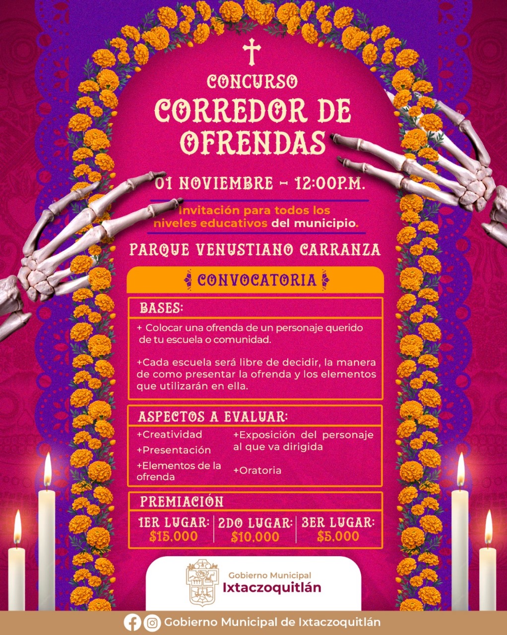 Córdoba, Ver.- El ayuntamiento de Ixtaczoquitlán, invita a los alumnos e instituciones educativas de todos los niveles, para participar en el Concurso “Corredor de Ofrendas”.
