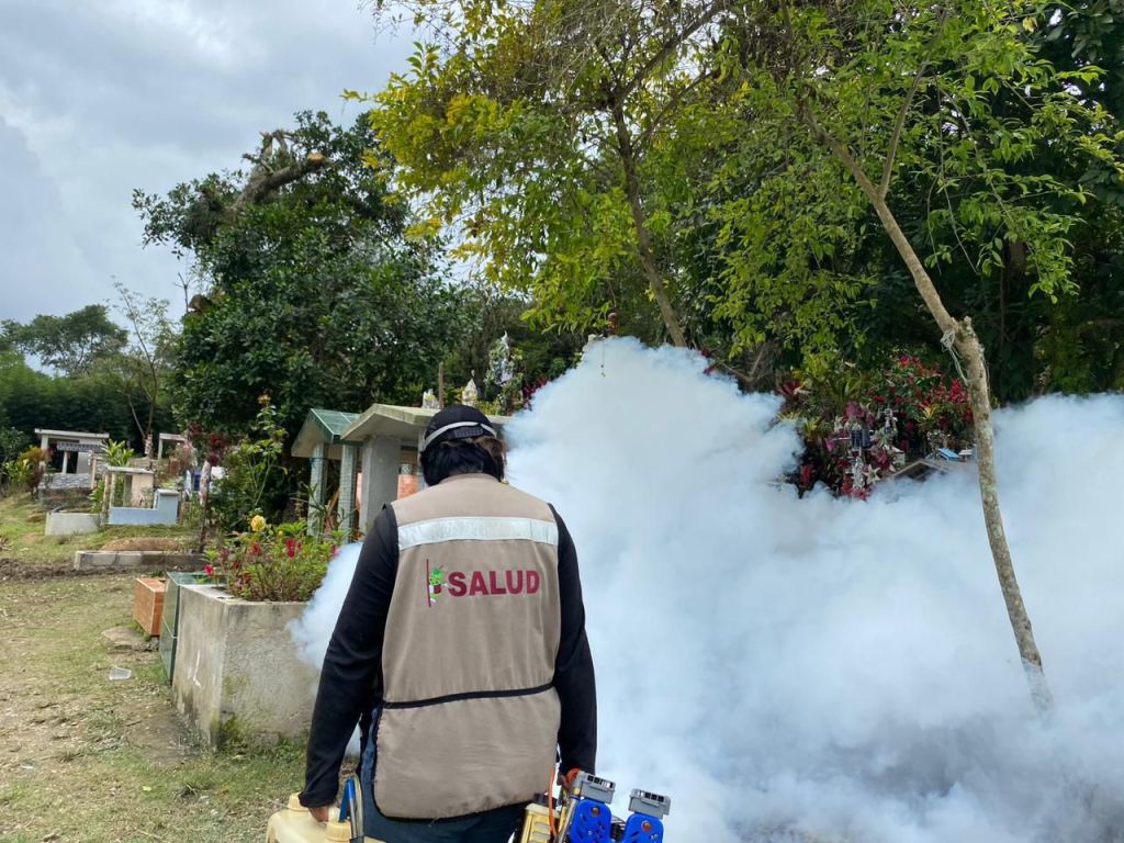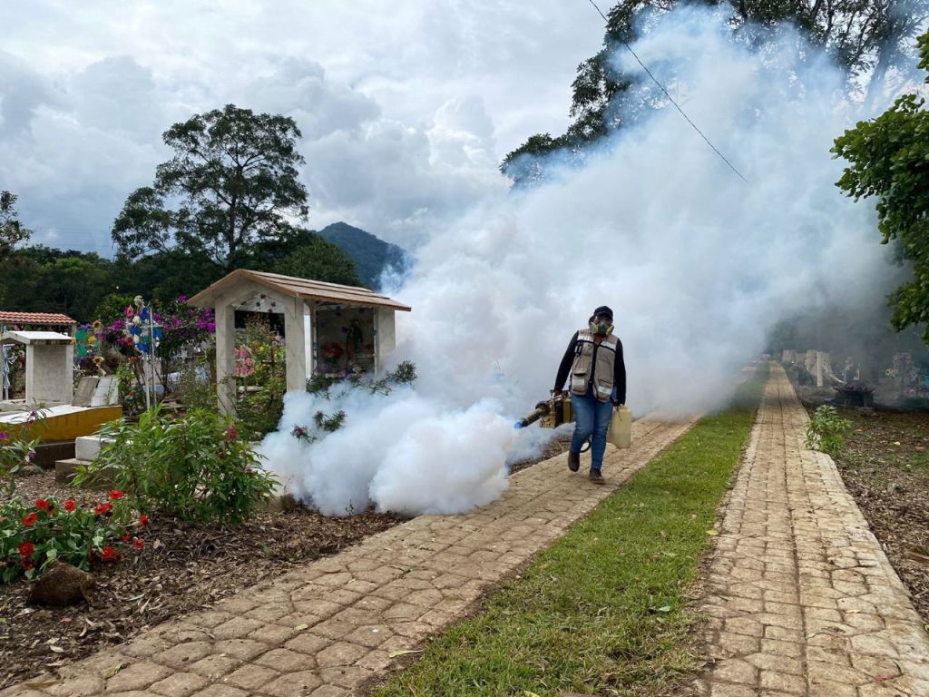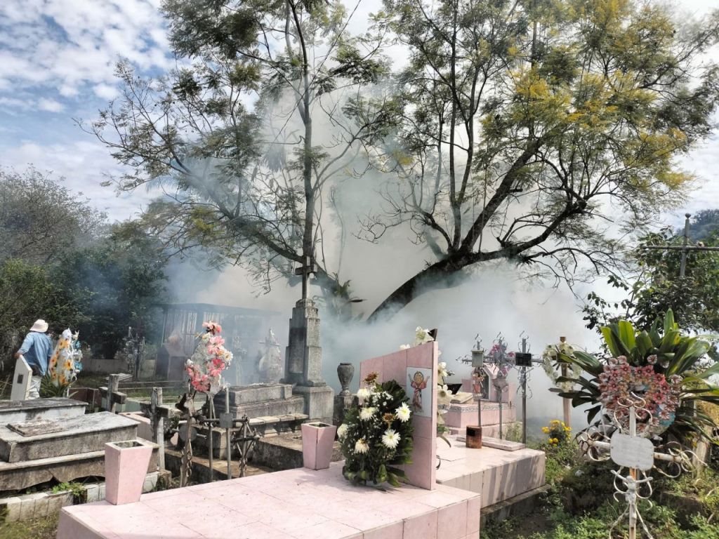 Ixtaczoquitlán, Ver.- Como parte de las actividades que el ayuntamiento zoquiteco, de cara a los festejos de todos santos y fieles difuntos, la coordinación de Salud Municipal, realiza recorridos en los panteones, como parte de las medidas preventivas para evitar la proliferación del mosquito del dengue, mediante jornadas de fumigación, así como aplicación de larvicida.