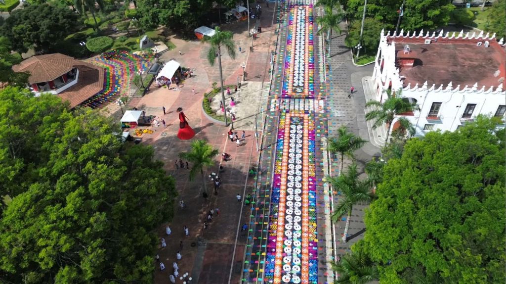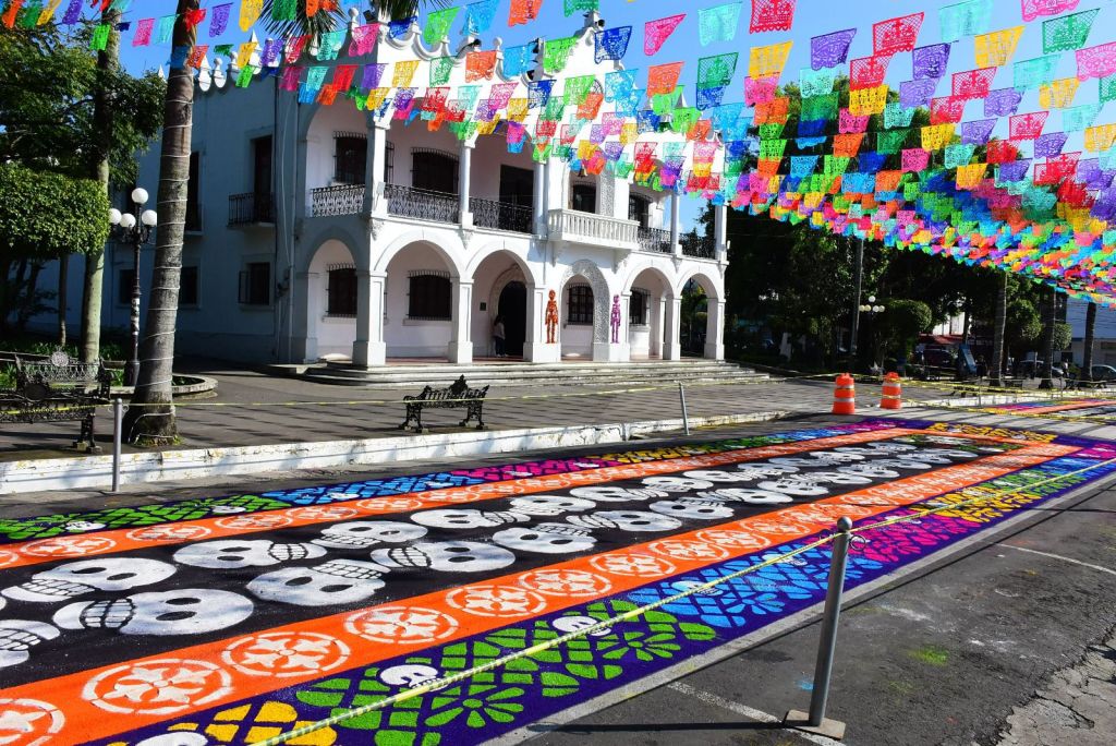 Fortín, Ver. – Con gran atractivo en conmemoración al Día de Muertos, luce el centro de Fortín, y gracias al respaldo del presidente municipal Gerardo Rosales Victoria se colocó un tapete de aserrín elaborado por artesanos de Huamantla, asimismo, los atractivos se complementan con grandes catrinas y la exposición de altares en el parque Lázaro Cárdenas.