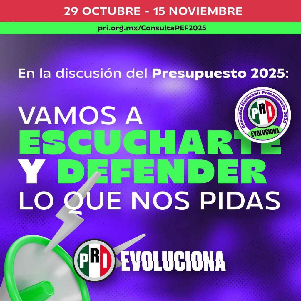 Xalapa, Ver.- En los próximos días en la Cámara de Diputados se discutirá y aprobará cómo se va a distribuir el presupuesto del Gobierno Federal durante el 2025. Ese dinero proviene de los impuestos que el pueblo paga, por ello el Partido Revolucionario Institucional (PRI) invita a la población a participar en la Consulta Nacional para conocer qué rubros deberían recibir más presupuesto el próximo año, como la seguridad, salud, educación, programas sociales, infraestructura, campo y pesca, medio ambiente, entre otros. Ingresa mediante tu teléfono móvil o computadora a https://pri.org.mx/consultapef2025 para participar y que desde la bancada legislativa del PRI, se defiendan los intereses del pueblo.