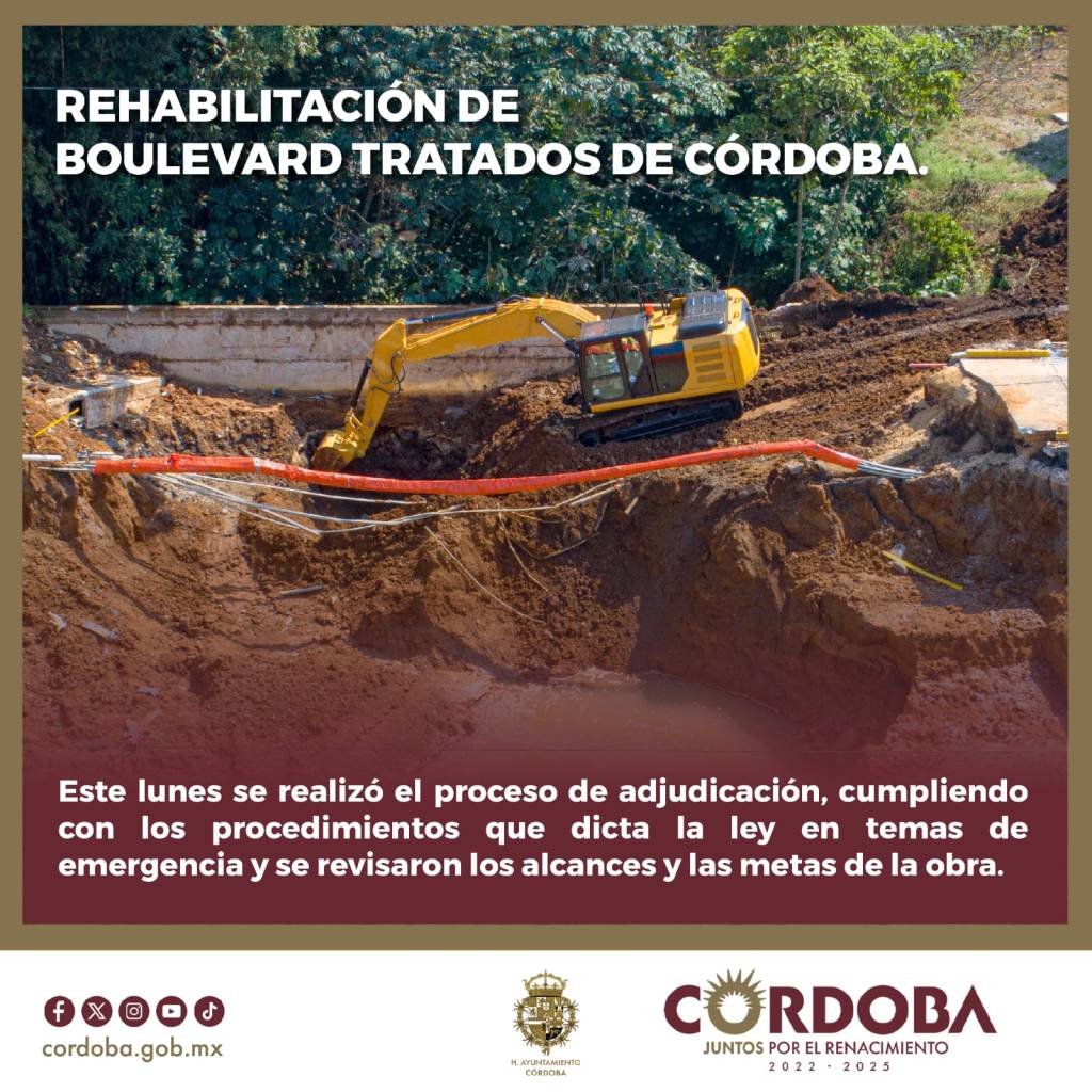 Córdoba, Ver.- Este lunes inició la contratación de los trabajos de rehabilitación en el boulevard Tratados de Córdoba, luego de que el Ayuntamiento de Córdoba realizara los procedimientos administrativos en el proceso de licitación que la Ley de Obras Públicas y Servicios Relacionados con las mismas del Estado de Veracruz de Ignacio de la Llave, marca en temas de emergencia.
