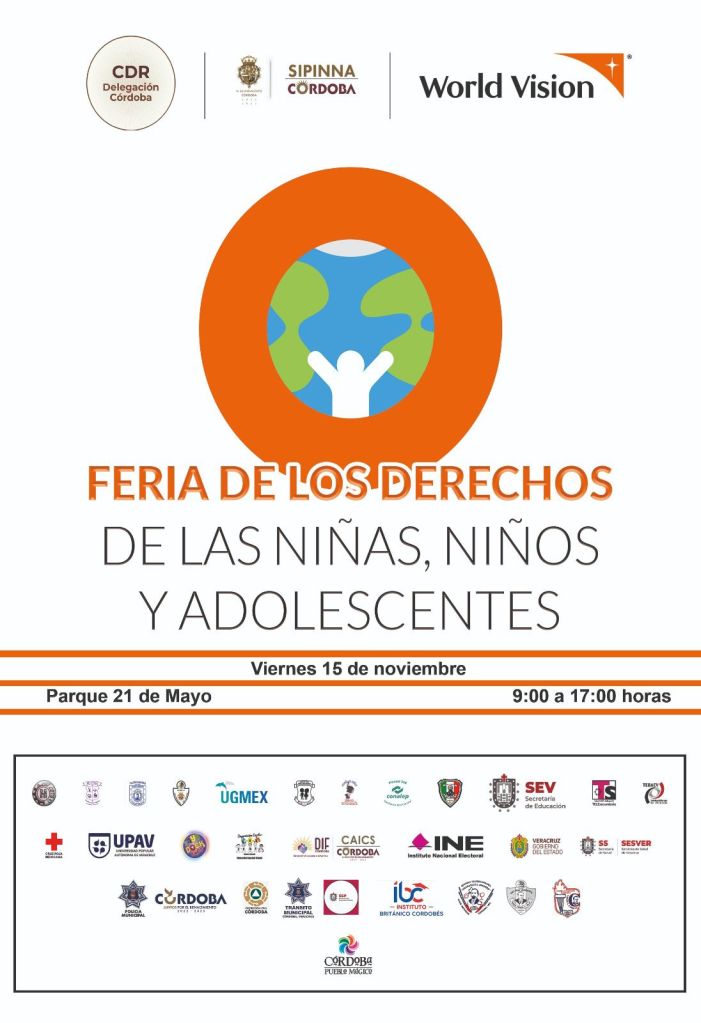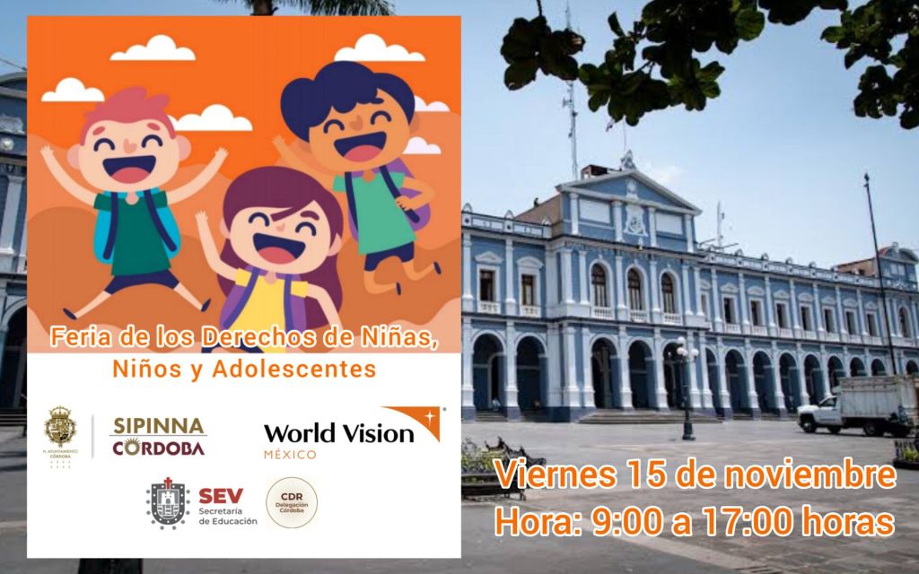 Córdoba, Ver.- World Vision México, la Delegación Regional de la SEV y la Secretaria de Protección Integral de Niñas, Niños y Adolescentes (SIPINNA), te invitan a la «Feria de los Derechos de Niñas, Niños y Adolescentes», que se llevará a cabo en la explanada del parque 21 de mayo, el próximo viernes 15 de noviembre a partir de las 9:00 y hasta las 17:00 horas.