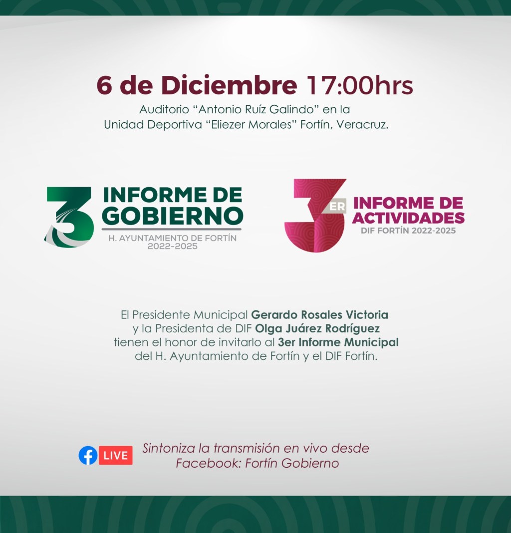 Fortín, Ver. – El próximo viernes 06 de diciembre a las 17:00 horas se llevará a cabo el evento del Tercer Informe de Gobierno por parte del presidente municipal Gerardo Rosales Victoria y a su vez, el Tercer Informe de Actividades de la presidenta del DIF Municipal, Sra. Olga Juárez Rodríguez.