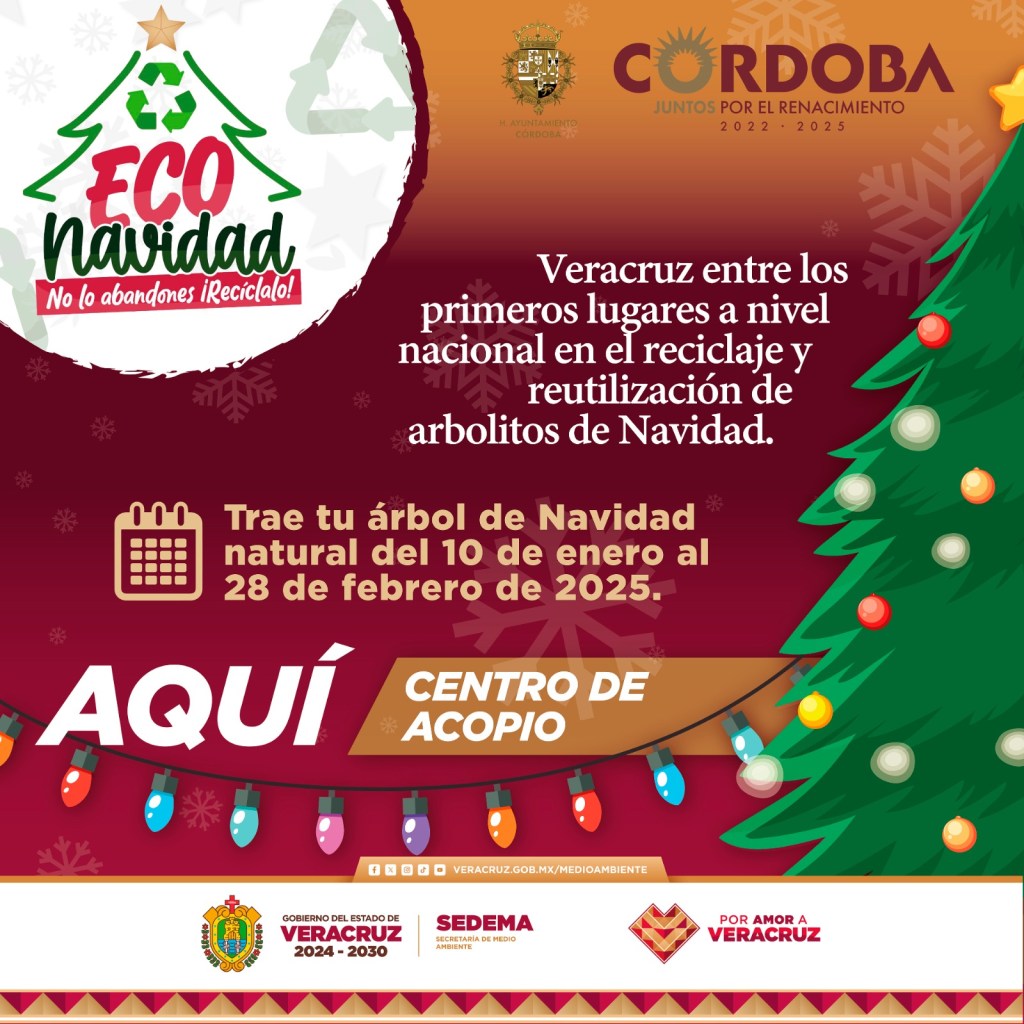 Córdoba Ver.- Con la instalación de 6 centros de acopio, a partir del 10 de Enero el municipio de Córdoba pondrá en marcha la Campaña Eco Navidad en donde los árboles naturales de navidad serán reciclados y reincorporados a la naturaleza