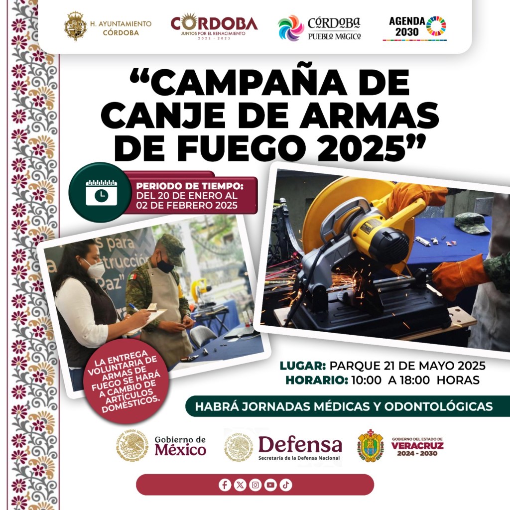 Córdoba, Ver.- Con el tema «Sí al desarme, sí a la paz», del 20 de enero al 2 de febrero, llegara a Córdoba el Canje de Armas de Fuego 2025 en el parque 21 de mayo en un horario de 10 de la mañana a 6 de la tarde.