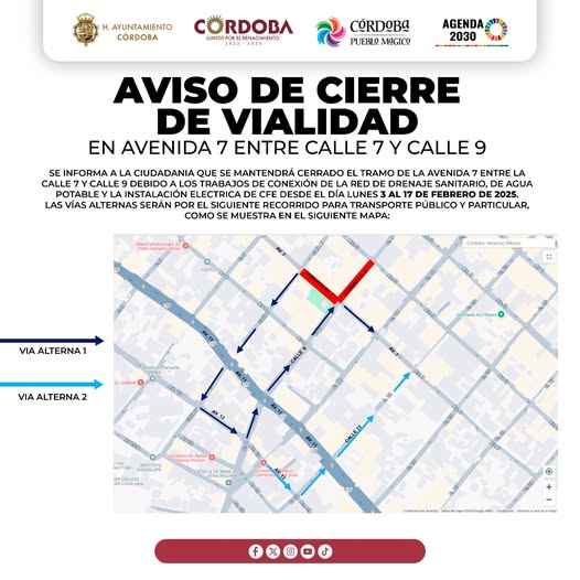 Córdoba, Ver.- La dirección de Obras Públicas e Infraestructura Municipal informa a la población que a partir de este lunes 03 de febrero hasta el viernes 17 de febrero se mantendrá cerrado el tramo de la avenida 7 entre la calle 7 y calle 9 esto derivado de los trabajos de Rehabilitación de la obra de la calle 9.