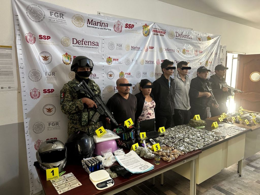 Como resultado de las acciones, se logró la detención de cinco personas; así como, el aseguramiento de 106 bolsas plásticas con hierba seca con características propias de la marihuana, 166 bolsitas con sustancia con características propias de la metanfetamina (cristal), 2 armas de fuego, 2 básculas grameras y 1 laptop; los detenidos y lo asegurado quedaron a disposición de la F.G.E. en el Mpio. de Tlapacoyan, Ver.