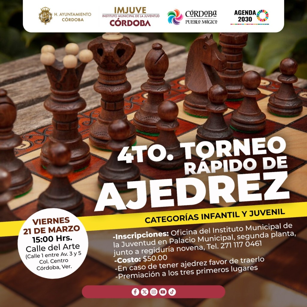 Córdoba, Ver.- El próximo 21 de marzo, se llevará a cabo el Cuarto Torneo de Ajedrez Rápido organizado por el Instituto Municipal de la Juventud, las inscripciones se encuentran abiertas y las categorías a disputar son infantil y juvenil.