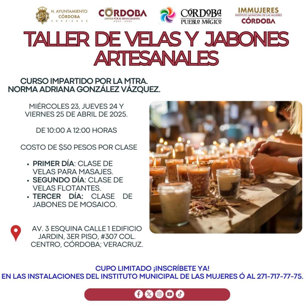 Córdoba, Ver.- Fomentando el empoderamiento y emprendimiento entre las mujeres cordobesas, el Instituto Municipal de las Mujeres, aperturó el taller de velas y jabones artesanales que se llevará a cabo los días 23, 24 y 25 de abril.