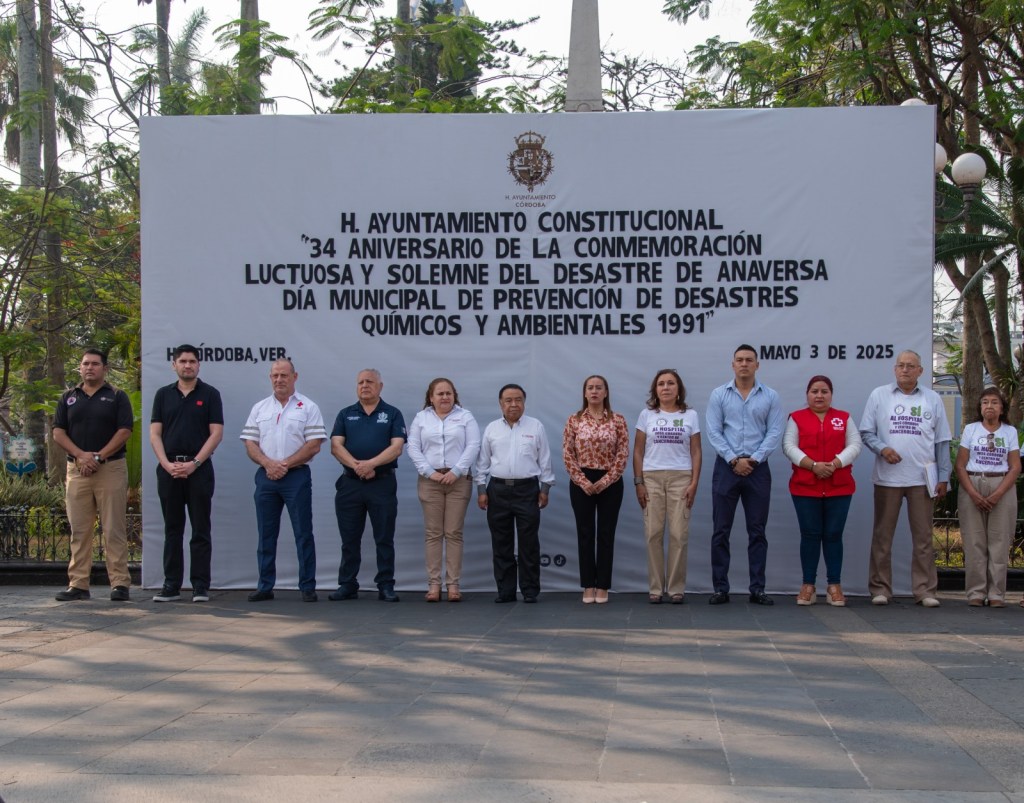 Córdoba, Ver.-Reunidos en la plaza cívica, autoridades municipales, integrantes de la Cruz Roja Mexicana delegación Córdoba y representantes de la sociedad civil llevaron a cabo en acto cívico con motivo del 34 aniversario de la conmemoración luctuosa y solemne del desastre de Anaversa, así como el Día Municipal de Prevención de Desastres Químicos y Ambientales 1991.