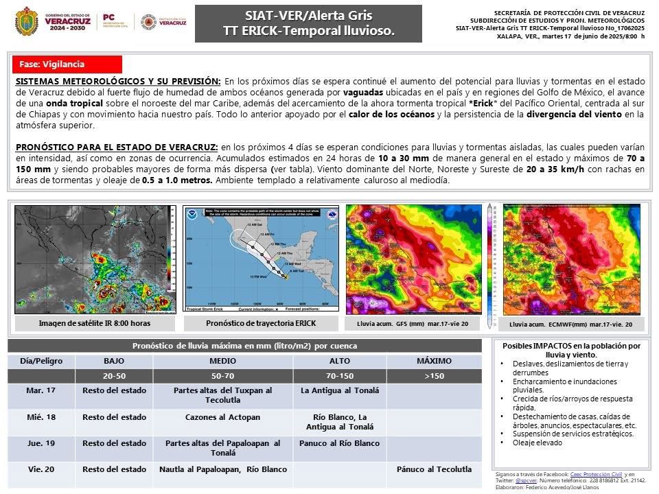 Jorge Tress Martínez, coordinador del área, dijo que, de acuerdo con la Alerta Gris emitida por la Secretaría de Protección Civil de Veracruz, se espera en los próximos 4 días condiciones para lluvias y tormentas aisladas, las cuales pueden variar en intensidad, así como en zonas de ocurrencia.