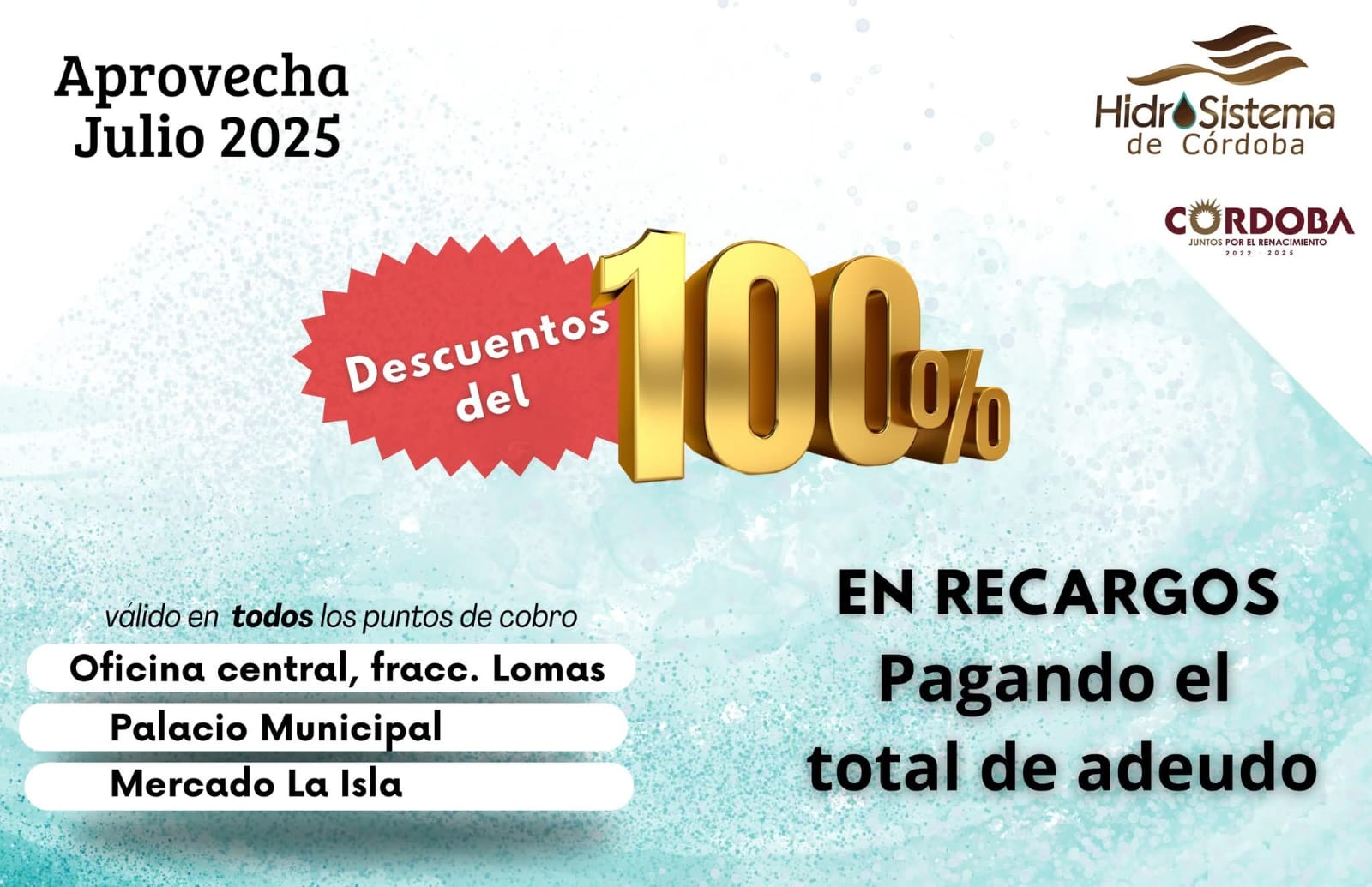 Córdoba, Ver.- En apoyo a la economía familiar, Hidrosistema de Córdoba aplicará el descuento del 100 por ciento en recargos y accesorios, para aquellas personas que acudan a realizar el pago del adeudo en una sola exhibición, la Regiduría quinta del Ayuntamiento de Córdoba, invita a los usuarios a aprovechar de este descuento que estará vigente durante todo el mes de julio.
