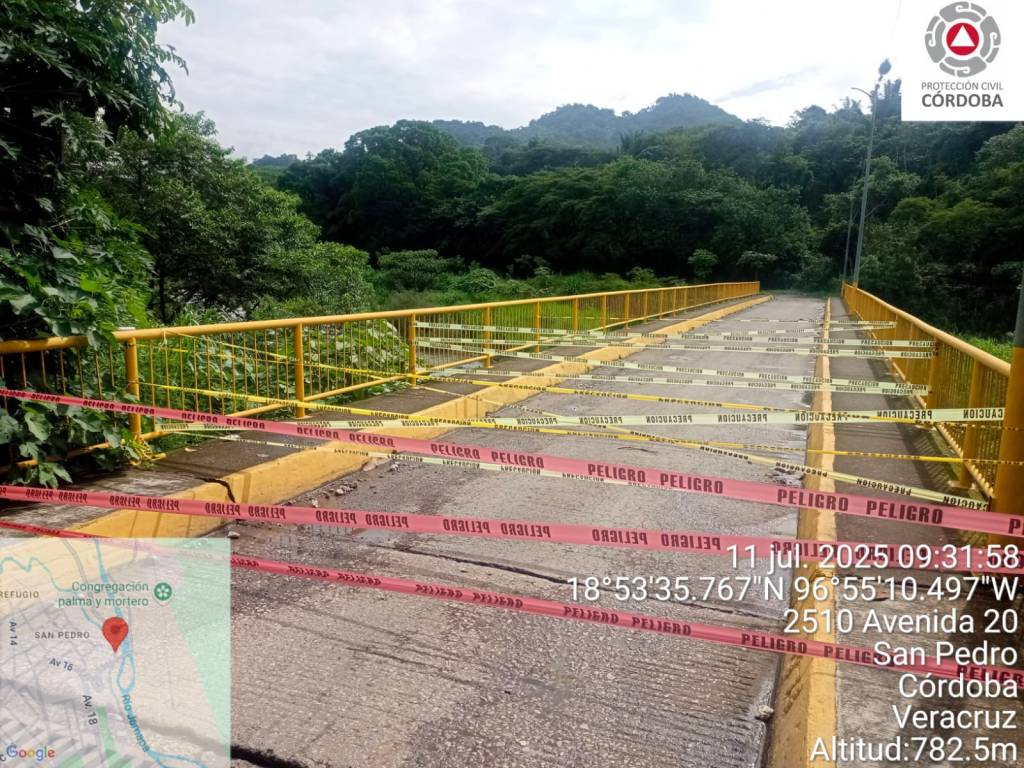 Córdoba, Ver.- Como una medida preventiva y de seguridad para la población que transita por la zona, el área de Protección Civil de Córdoba realizó el cierre de vialidad y acordonamiento en la carretera que comunica a la comunidad de Agustín Millán a la altura del Puente Bejuco, esto a raíz de las lluvias presentadas en la madrugada lo que causó el daño a la infraestructura vial.