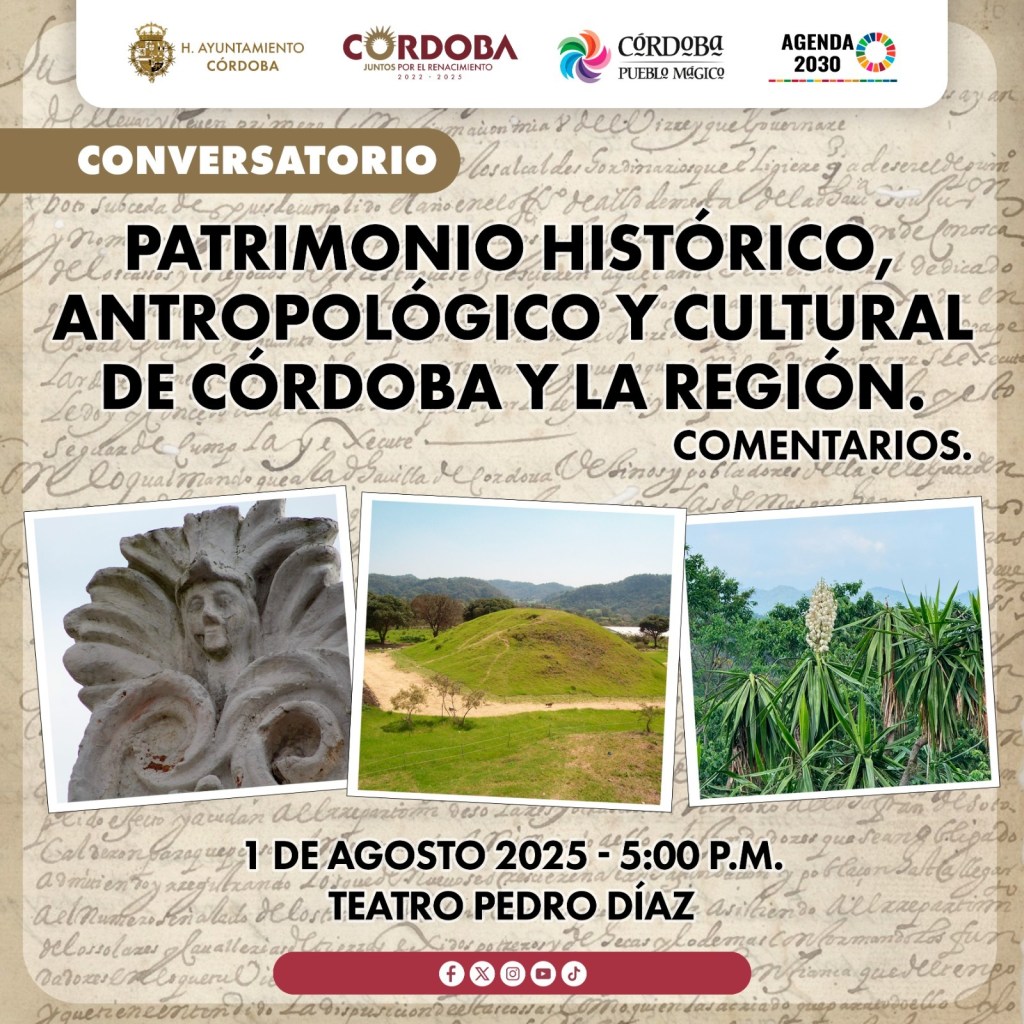 Córdoba, Ver.- Buscando nutrir a la población de todos los elementos patrimoniales de la ciudad, el Ayuntamiento llevará a cabo el conversatorio “Patrimonio histórico, antropológico y cultural de Córdoba y la región”, a fin de compartir y destacar aquellos no solo tangibles sino intangibles tales como las costumbres, las tradiciones, la gastronomía y la lengua.