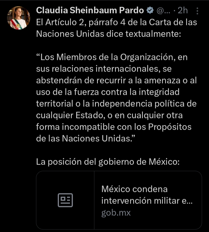 El Gobierno de México condena y rechaza enérgicamente las acciones militares ejecutadas unilateralmente en las últimas horas por fuerzas armadas de los Estados Unidos de América contra objetivos en territorio de la República Bolivariana de Venezuela, en clara violación del artículo 2 de la Carta de la Organización de las Naciones Unidas (ONU).