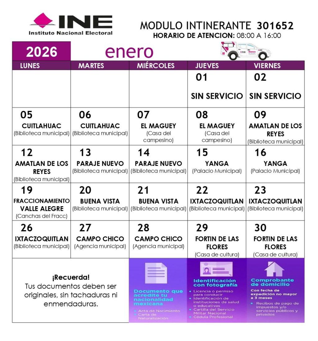 Fortín, Ver.- Luego del periodo de descanso del Instituto Nacional Electoral (INE), este mes se reactivaron los servicios del módulo itinerante del Registro Federal de Electores (RFE), siendo las fechas establecidas para el municipio de Fortín, los días jueves 29 y viernes 30 de enero del año en curso.